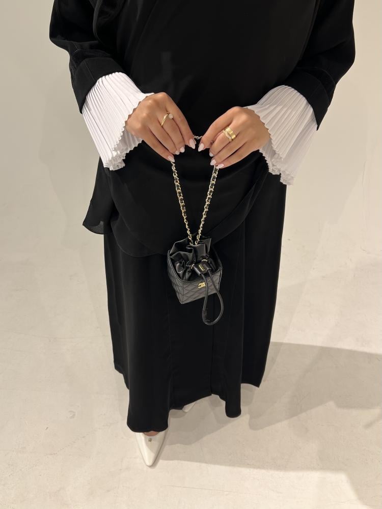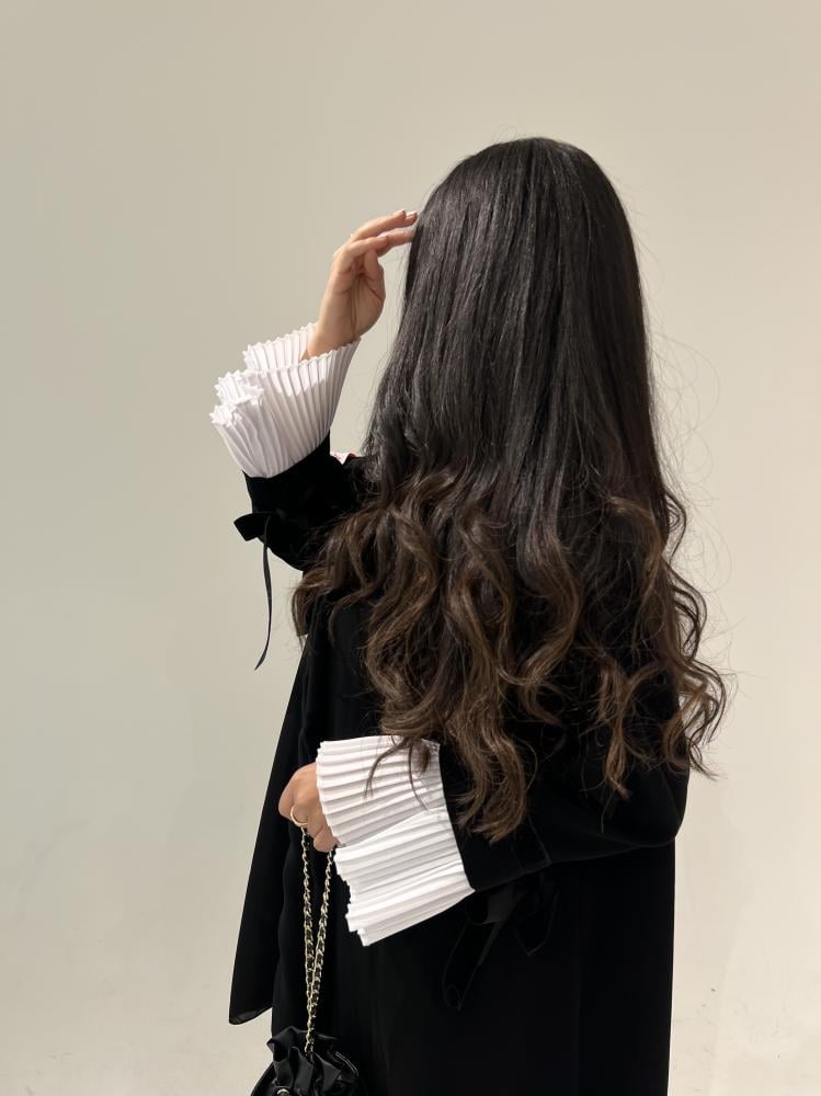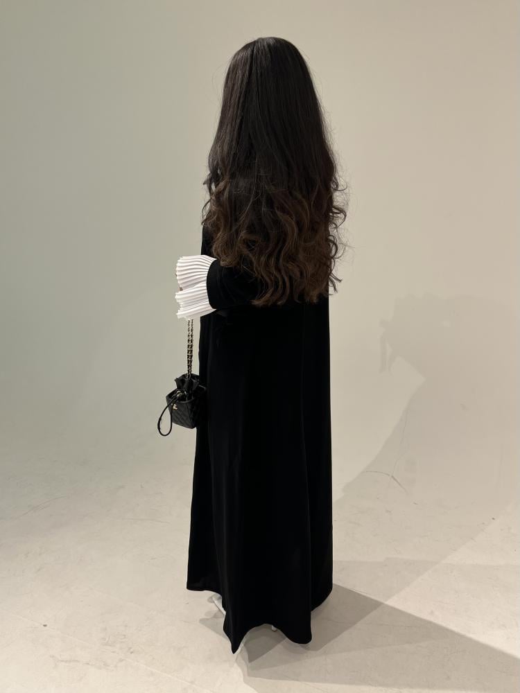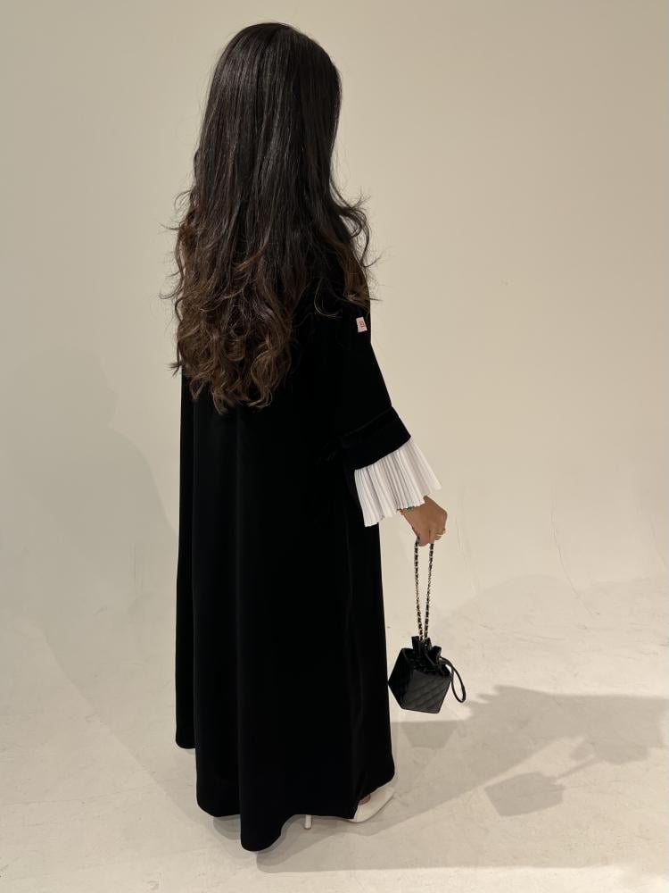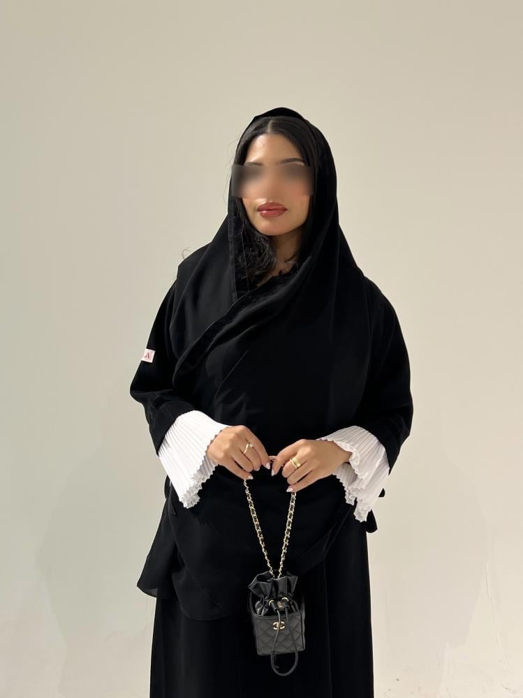 نوع القماش : سراميك ( صيفي ) مع تدخيلة اكمام باللون الابيض و شرايط مخمل اسود